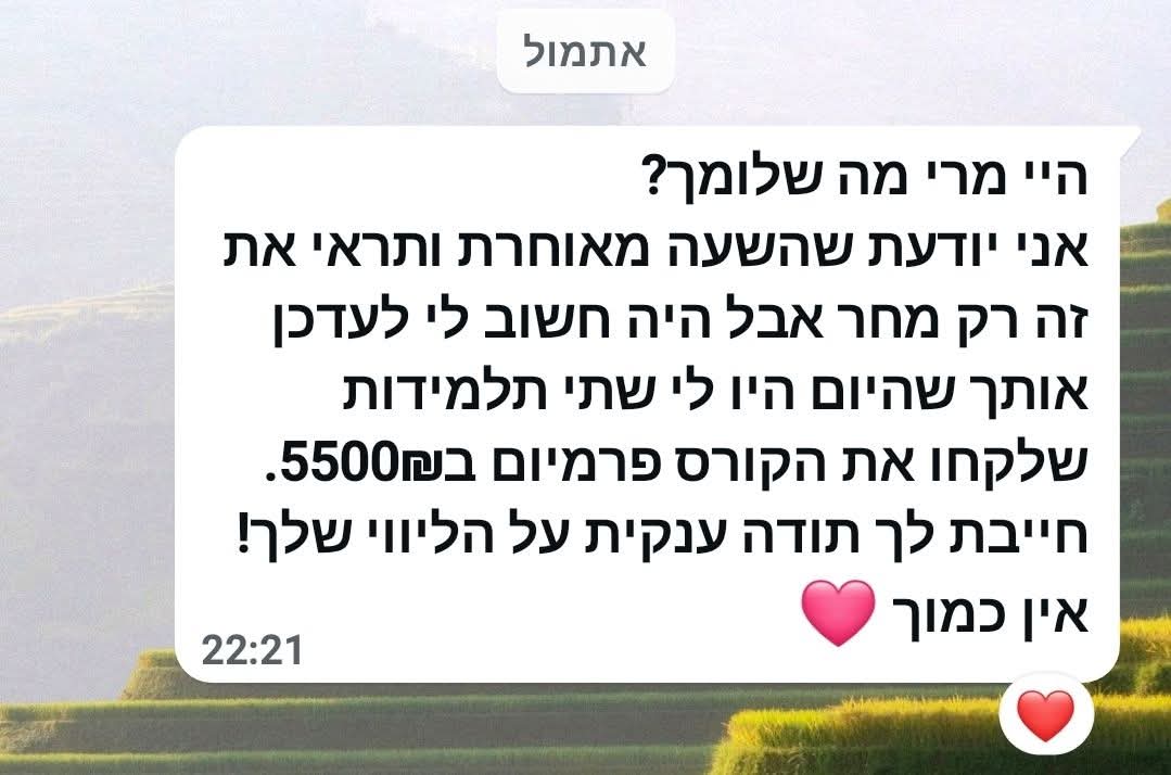 תודה רבה לך. זאת פעם ראשונה שאני חווה ליווי ויעוץ עסקי באופן כזה שאת עוזרת לי לעשות סדר במוצרים, שיווק סדר שנתי. בכל שנותיי בעסק, חוויתי יועצים ומלווים עסקיים, אבל אף אחד מהם לא היה כה מסור, מדויק, אכפתי וחד כמוך.מודה על ההכרות איתך. אני כל פעם מרגישה שעולה עוד מדרגה, עוד שלב ואוהבת ממש את מה שנוצר מכך.ואני כבר רואה תוצאות בשטח בזכות העבודה שאני עושה איתך וזה הכי מרגש, מחזק ונותן מוטיבציה ורצון להמשיך עוד ועוד ולהתפרנס ממה שאני אוהבת לעשות.🙏❤️🙏 *תמונה להמחשה בלבד