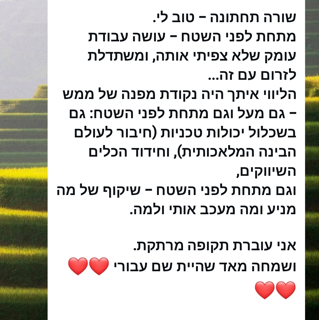 אחרי שכבר הייתי בעוד יעוץ הכוונה ללימודים הגעתי מאוד מבולבלת ובין פגישה לפגישה הרגשתי התליך שעושה לי סדר למחשבות לרגשות ולרצונות שלי והלחץ של למצוא מה מתאים לי ירד קצת. מאוד היה משמעותי לי כל השאלות על עצמי ובכללי שאלות שהרגשתי שממש כיוונו אותי לגבש איזשהי הבנה התהליך נתן לי יותר אמונה בעצמי וביכולות שלי ומביא איתו יותר מוטיבציה וכמה רצון להתקדמות.