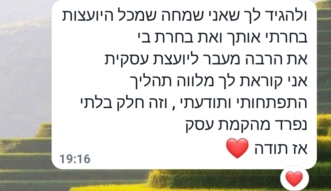 מרי היקרה , אחרי תקופה ממושכת של התלבטויות בתחום הקריירה, מודעת הפייסבוק שלך צדה את עיניי ונגעה בי במקום הכי מדויק. מכאן זה המשיך לשיחה טלפונית שבסופה לא היה לי ספק שכדאי לי מאוד לפגוש אותך, כי את בהחלט זו שעשויה להוביל אותי למציאת שביל הקריירה הנכון לי אחרי תקופה ממושכת של התלבטויות . הפגישה איתך היתה בהחלט חוויה עוצמתית .בתהליך ייחודי הובלת אותי לגלות כל כך הרבה על עצמי ובעיקר על מה שמסתתר עמוק בתוכי. הענקת לי המון ביטחון וחיזוק , תובנות וכללי החלטה לקראת יציאה לדרכי החדשה . לאחר פגישתנו , תהליך חיפוש הדרך החדשה התחיל לנוע בקצב די מהיר ואפילו מסחרר. את ההחלטה הלא פשוטה אני עומדת לקבל תוך מספר שעות... תודה לך על הכל ! היה לי העונג והכבוד להכירך, תודה על הסבלנות, הרגישות ובעיקר המקצועיות. מה שלא יהיה, לא שוכחת את הפגישה והתהליך איתך. זה תרם לי המון לביטחן, ליכולת ההחלטה והבחירה בין החלופות. המון תודה על הכל בהמון הערכה *תמונה להמחשה בלבד