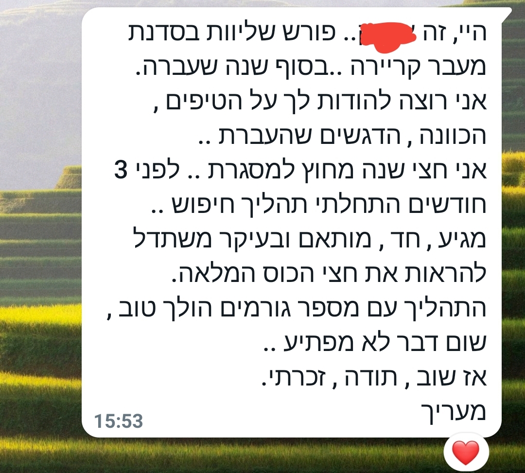 התנגדות שלי לתהליך בירור הקריירה העתידית הייתה גלויה וברורה, ובכל זאת המשכנו. בסופו של דבר הצליחה מרי להנחות אותי להבין את מטרתי ודרך הפעולה שלי, להבין שיש ביכולתי להצליח . וכבר יש לי כיוון והבנה שאני אכן יכול!!! *תמונה להמחשה בלבד