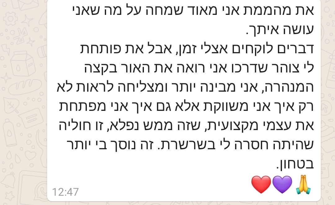 ניישם תובנות אלו בפעולות ממשיות בשטח לראיית תוצאות אמיתיות. ניסיוני הרב בשטח מוכיח ששילוב עבודה פנימית עמוקה עם צעדים מעשיים מוביל לשינוי משמעותי ארוך טווח.